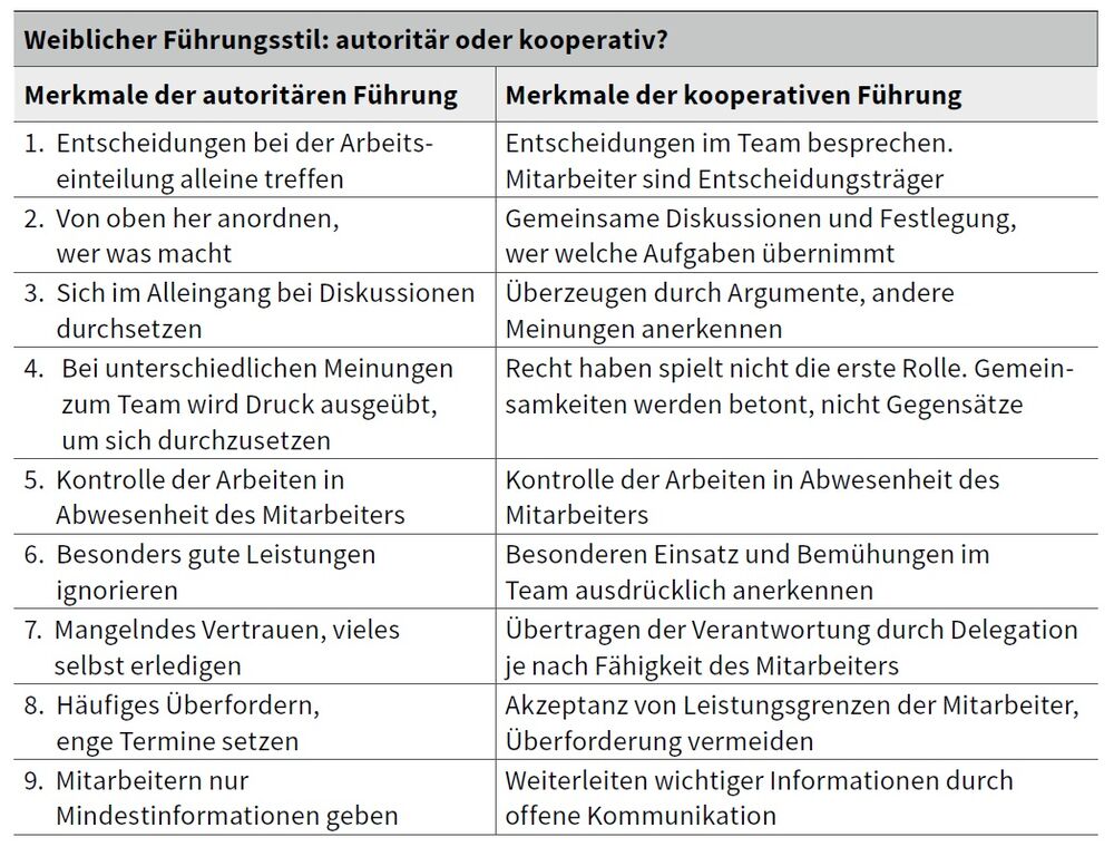 Startet eine Frau in der Vorgesetztenposition, kommt es für sie auf die ersten Tage an. Tritt sie selbstbewusst auf, überrascht das Mitarbeiter, die es gewohnt sind, dass ein Mann die Leitung hat. Ausnahmen von diesem Denkmuster werden sogar extra betont. Gelegentlich hat die Leiterin Selbstzweifel und behindert sich dadurch selbst. Sie vermutet, dass die Zusammenarbeit in der Männerdomäne mit Schwierigkeiten gepflastert ist. Männer können ihre Erfolge besser in den Vordergrund stellen und sich gut verkaufen. Während Männer meist zur Selbstüberschätzung neigen, präsentieren sich Frauen weniger offensiv, sie unterschätzen eher ihr Können. Bescheidenheit ist bei Frauen der Generation Z aber nicht mehr üblich. Als Vorgesetzte haben sie Autorität ohne autoritär zu führen. Souveränes Auftreten und Organisationstalent machen sie als Autorität glaubwürdig. Ihre Führung gibt dem Team Orientierung, Sicherheit und Halt. Mit Persönlichkeit und Ausstrahlung überzeugen sie schneller als mit ihrer Position. Und obendrein ist es wichtig, dass sie beliebt sind.